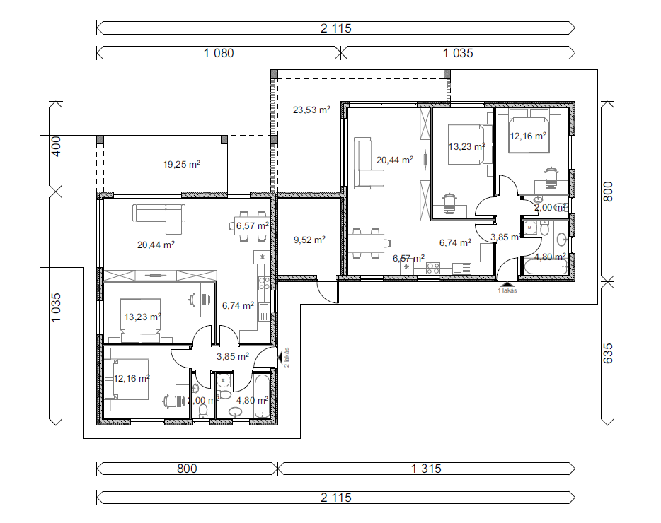 1. lakás+2. lakás+Gépészet helyiség Össz nettó: 163,31 m²